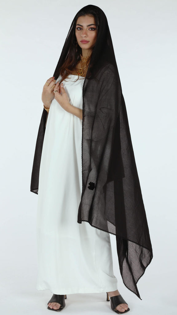 شيلة بيت شغل منثرات خرز ، ثابتة على الراس راقية ناعمة وخفيفة خامة ويل مريحة وتتميز بالجودة العالية وممتازة للإستخدام اليومي، اللون: أسود الطول: 214 سم العرض:106 سم