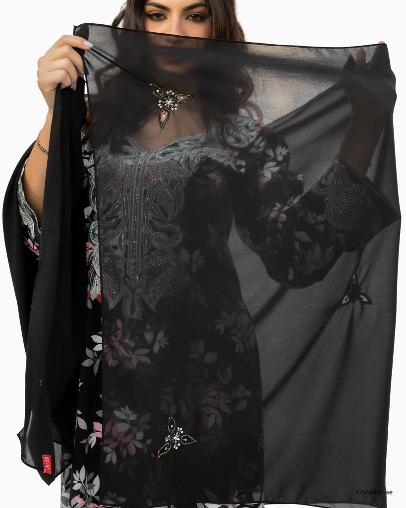 شيلة نجمة سهيل سودة منثرات بأجود انواع الفصوص و الخرز خامة دجى الليل ثابتة عالراس وراقية.. تعطي طلتج انوثة و احتشام من تصميمنا الخاصة بشغل يدوي 100%ملاحظة: الغسيل يدوي للمحافظة على الشيلة لمدة أطول