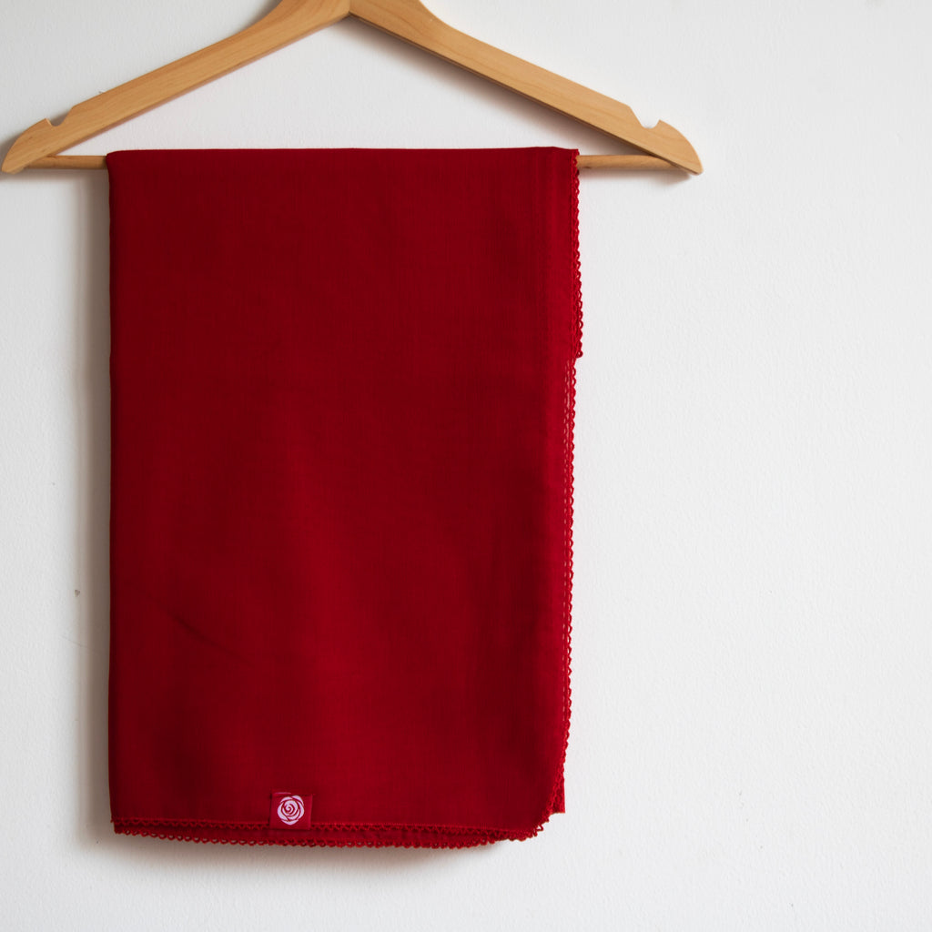 شيلة بيت سادة و أطرافها كروشيه اربع جهات، ثابتة على الراس راقية ناعمة وخفيفة خامة ويل مريحة وتتميز بالجودة العالية وممتازة للإستخدام اليومي، اللون: أحمر الطول: 214 سم العرض:106 سم